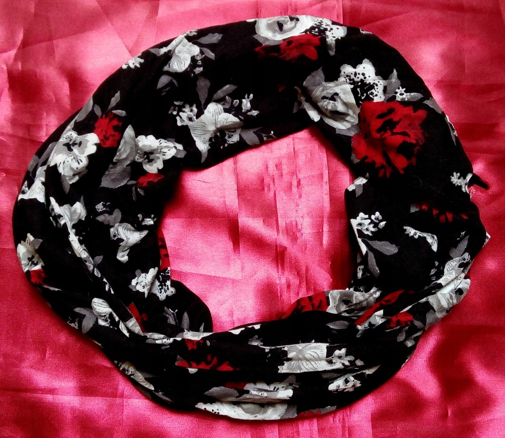 Mam jedną gumkę do włosów typu scrunchie z wiszącymi końcami, która jakby imituje apaszkę. Ma kolorowy, roślinny wzór, który sam w sobie jest ładny, ale prawie do niczego w mojej szafie nie pasuje… czasem zakładam ją, gdy idę w odwiedziny do osoby, która mi ją podarowała :D.